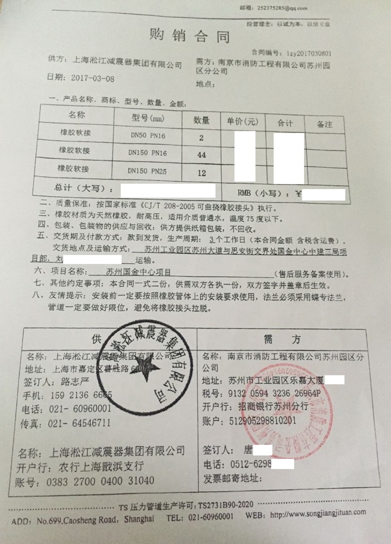 淞江集團為本項目提供的橡膠軟接頭產品,型號DN50、DN150為16公斤壓力的,DN150為25公斤壓力的,橡膠材質為天然橡膠,耐高壓,適用介質為普通水,溫度75度以下,淞江集團為國內眾多高樓項目提供橡膠軟接頭產品。