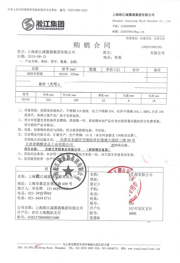上海淞江減震器集團有限公司介紹:天津蘭芳園食品香飄飄奶茶波紋補償器合同項目信息,淞江集團為眾多食品企業提供衛生級減震器產品,我廠食品級橡膠接頭通過國家質檢部門通過并頒發檢測報告。