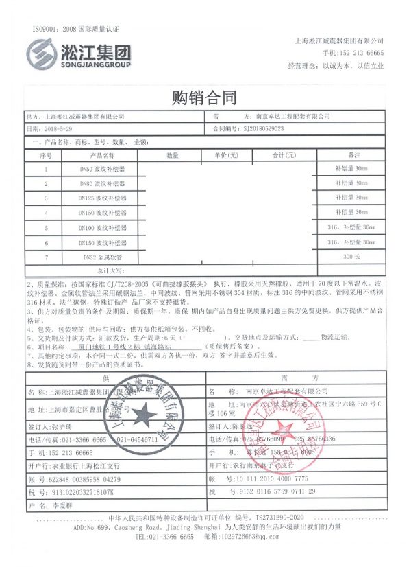 廈門地鐵1號線二標段橡膠伸縮節合同項目