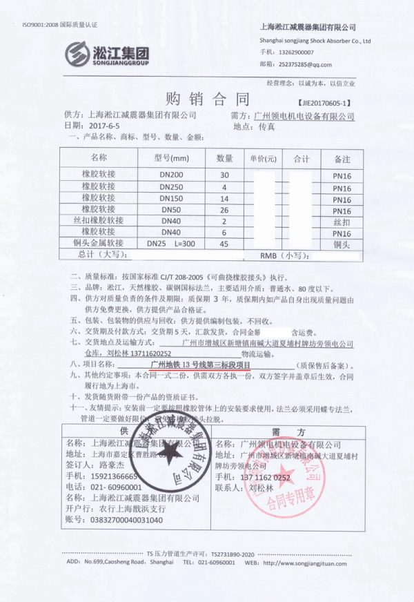 上海淞江減震器集團有限公司為您介紹:廣州地鐵13號線第三標段金屬軟管合同項目信息,淞江集團為全國眾多城市地鐵項目配套不銹鋼金屬軟管產品,該產品主要用于消防系統和暖通系統。