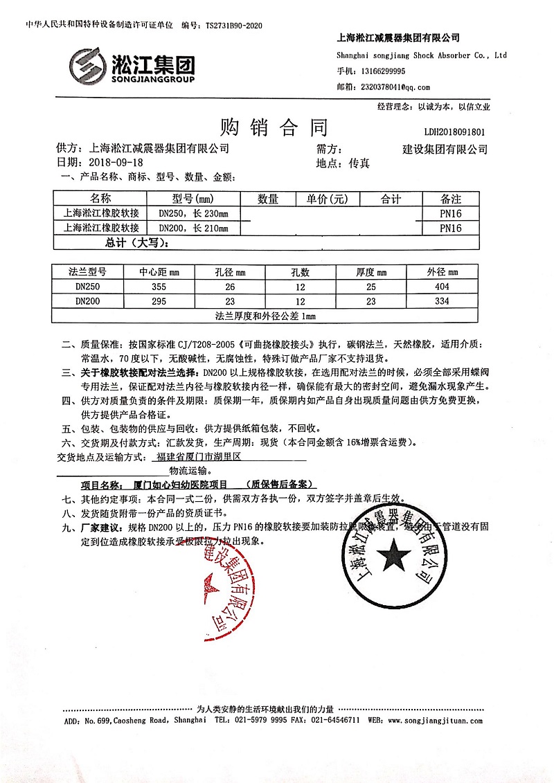 上海淞江減震器集團有限公司為您介紹:廈門如心婦幼醫院橡膠軟接頭項目信息,淞江集團銷售在2018年9月18日簽下該合同,為廈門如心婦幼醫院提供橡膠軟接頭產品。